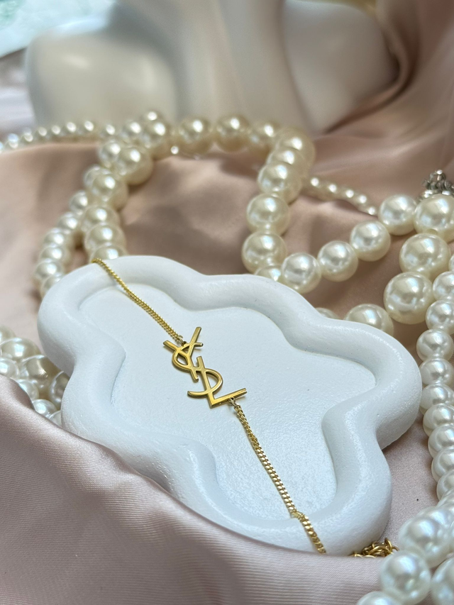 Raffinement et luxe se rencontrent dans ce bracelet en argent sterling plaqué or, orné du design emblématique YSL. La chaîne fine souligne la délicatesse du poignet, tandis que le logo reflète un goût raffiné.